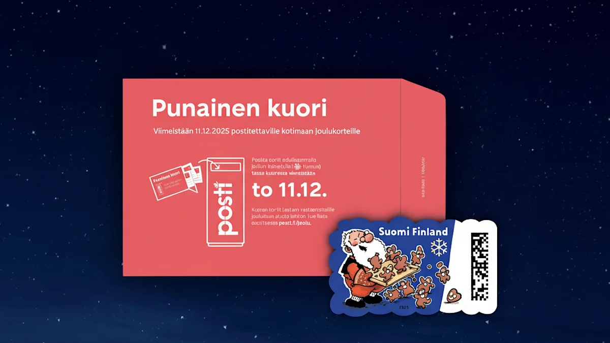 Posti delivers the red mailing envelope to homes that receive advertising. You can also pick it up from Posti outlets and retailers. Use it to send Christmas cards with the cheaper no-value indicator stamp.