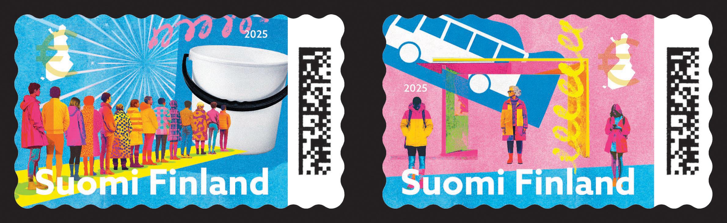 Finns have several national habits, two of which are presented in colorful stamps designed by Miika Saksi. On the first stamp, people are lined up for free buckets, which is a well known way of getting Finns moving. On the second stamp, people are waiting for a bus at a bus stop and, as is common in Finland, they keep their distance from other passengers. Finnish Habits will be a 10-stamp sheet containing two different domestic no-value indicator stamps.