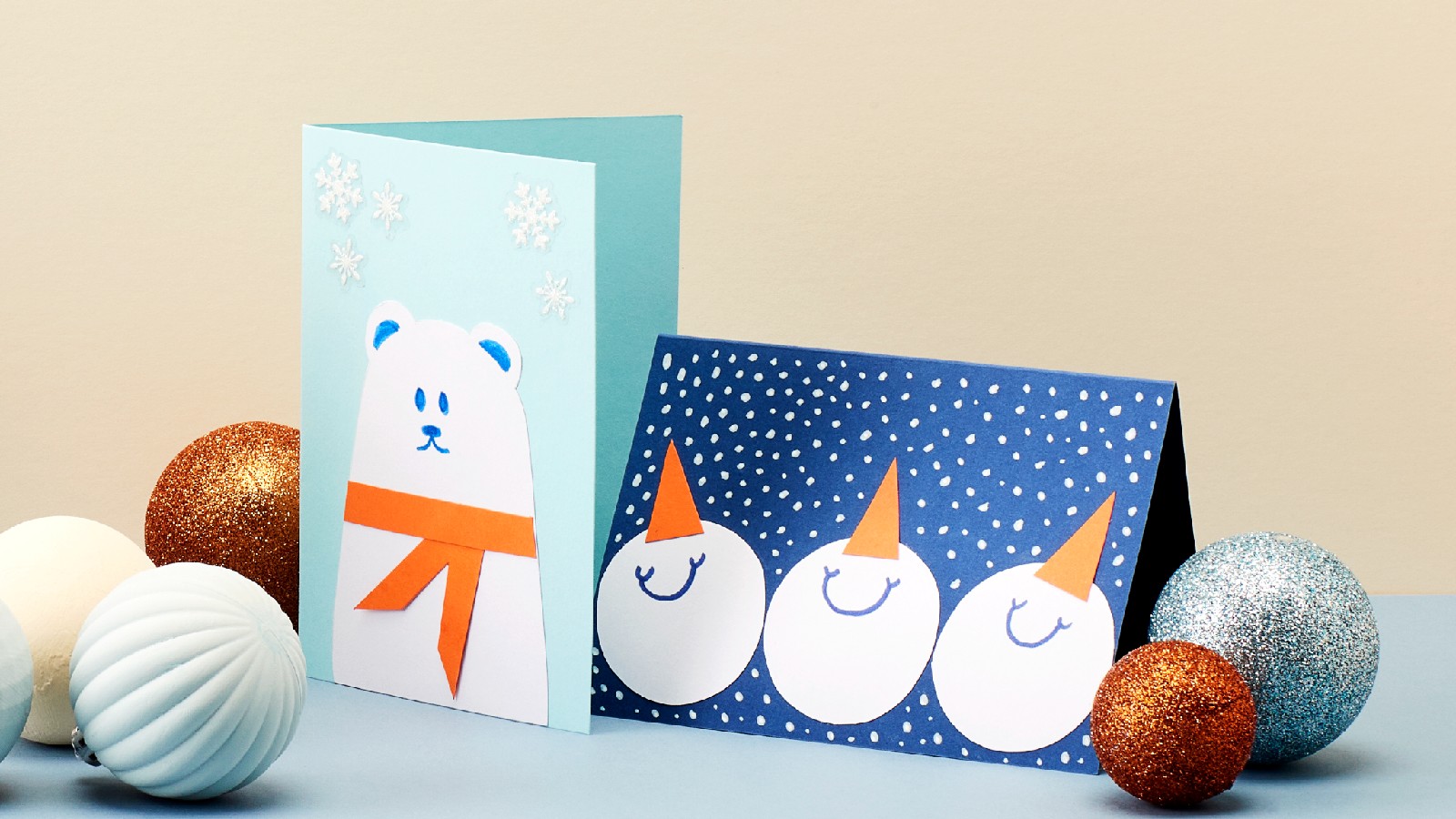 Playful snowmen. Cut three heads of snowmen out of white card paper and draw happy mouths on them. Glue the heads and carrot noses cut out of orange paper onto your card. Use a marker to draw a heavy snowfall around the snowmen.