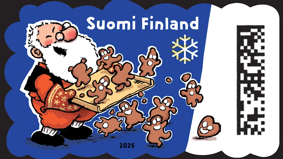 ”Merkkien värimaailma on selkeä ja modernin jouluinen. Sininen ja punainen väri erottaa merkit selvästi toisistaan. Merkkien hammastus mukailee kivasti piparin muotoja”, Jenna kertoo.