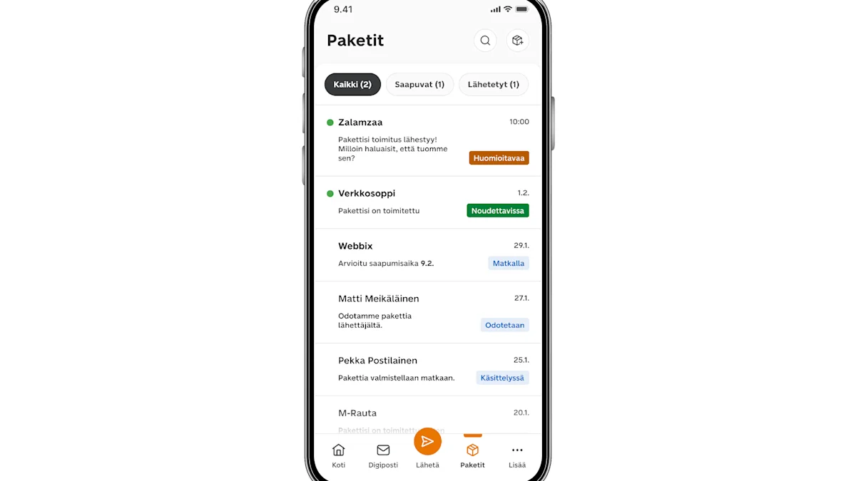 Näet saapuneet ja lähetetyt paketit erikseen, ja tilat on merkitty selkeillä tunnisteilla kuten “Matkalla” tai “Noudettavissa”.