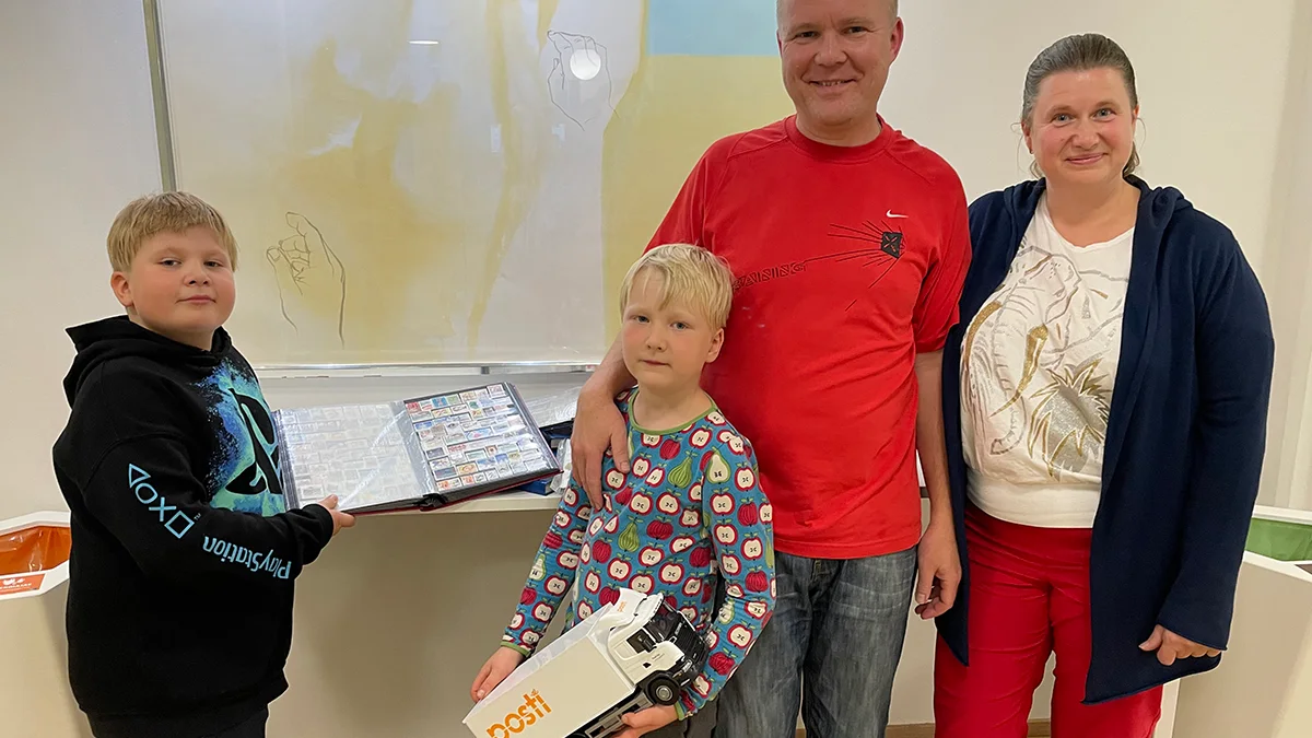Att samla frimärken är en hobby för hela familjen. På bilden, förutom Lukas, mamma Kadri, pappa Tomi och lillebror Hannes.
