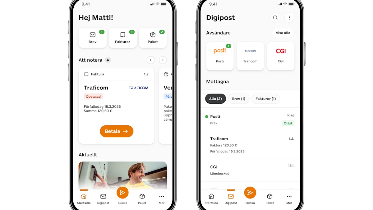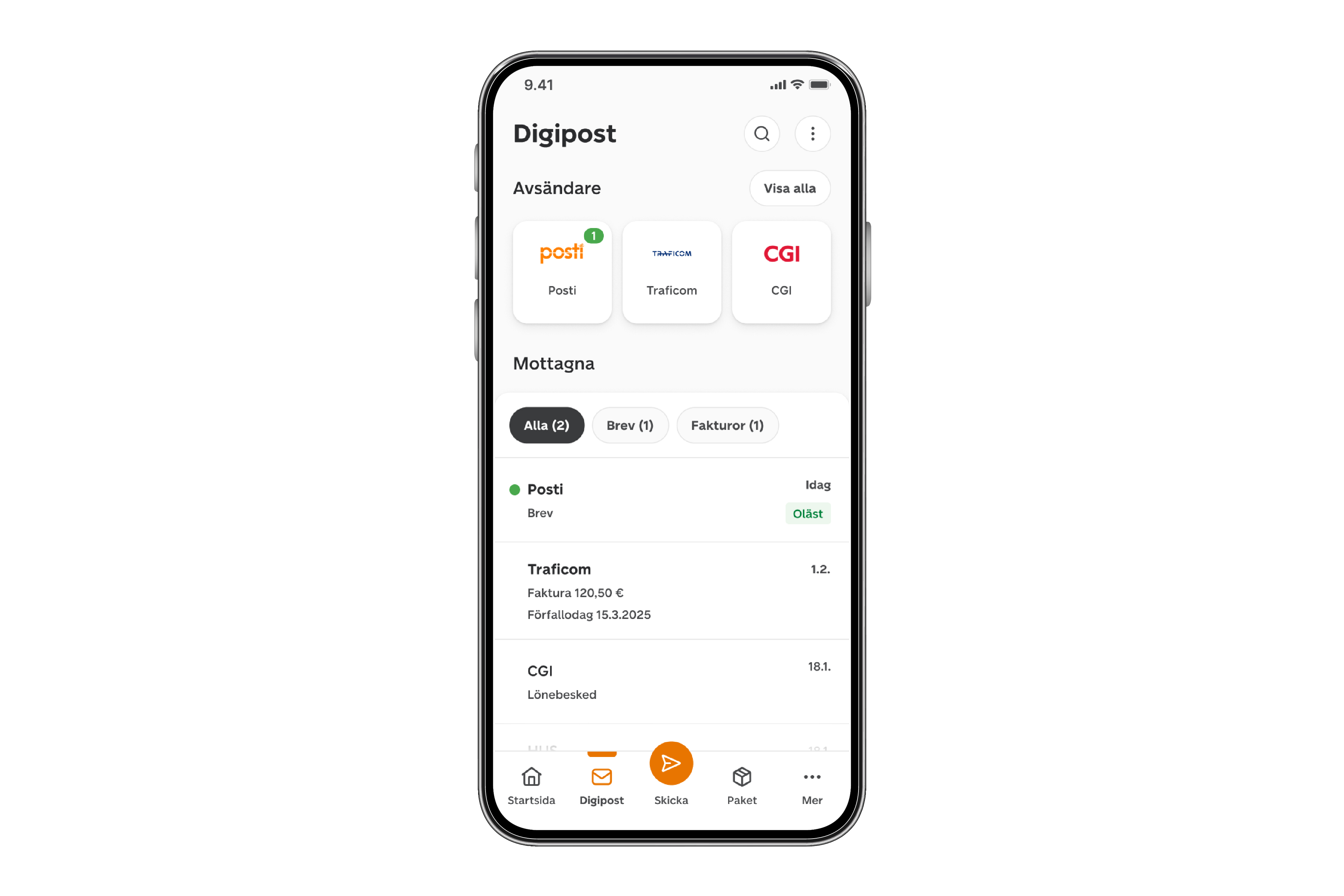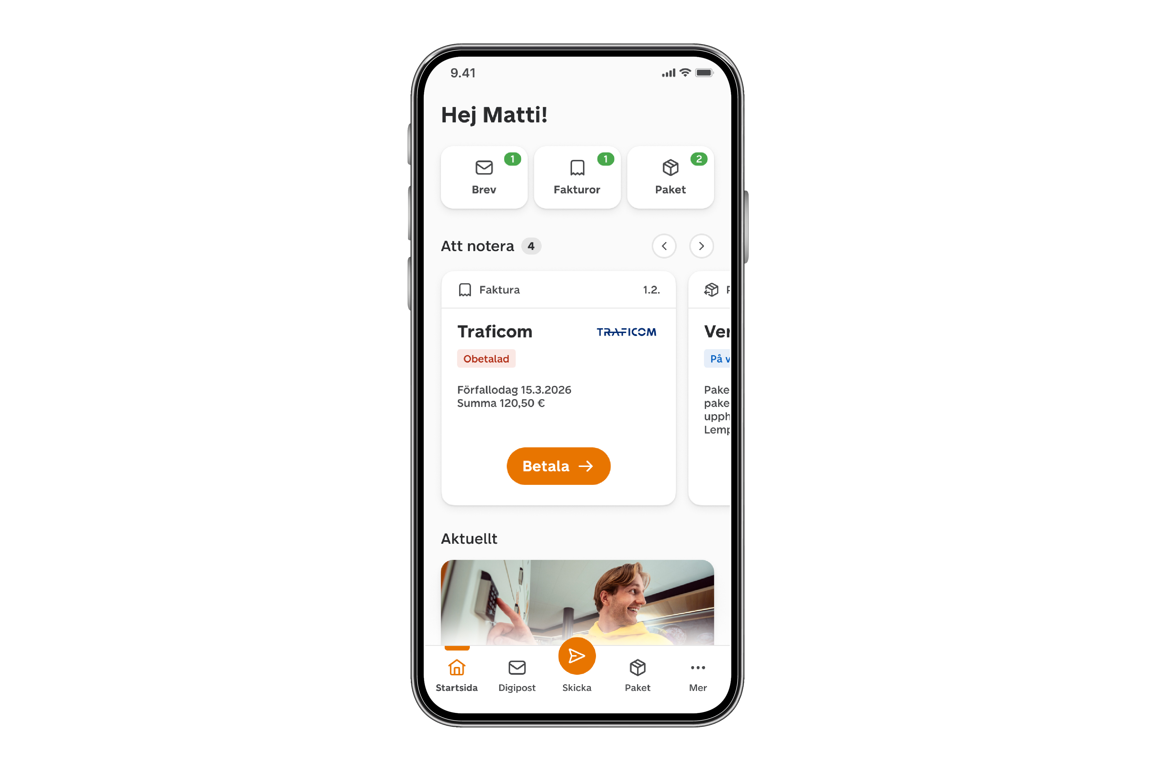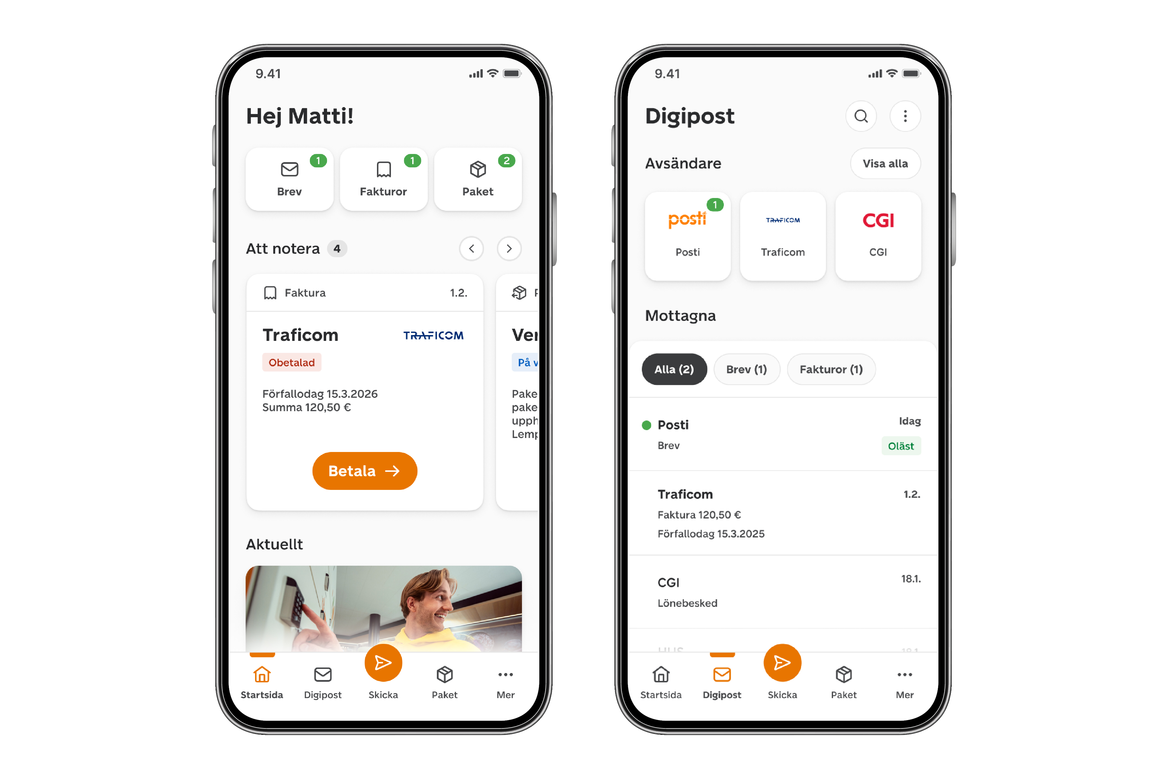 De flesta som använder OmaPosti öppnar appen för digipost – de vill snabbt se sina brev och fakturor och hantera dem enkelt. Därför har vi förnyat appens struktur och gränssnitt: digipost och paket visas nu sida vid sida direkt på startsidan.