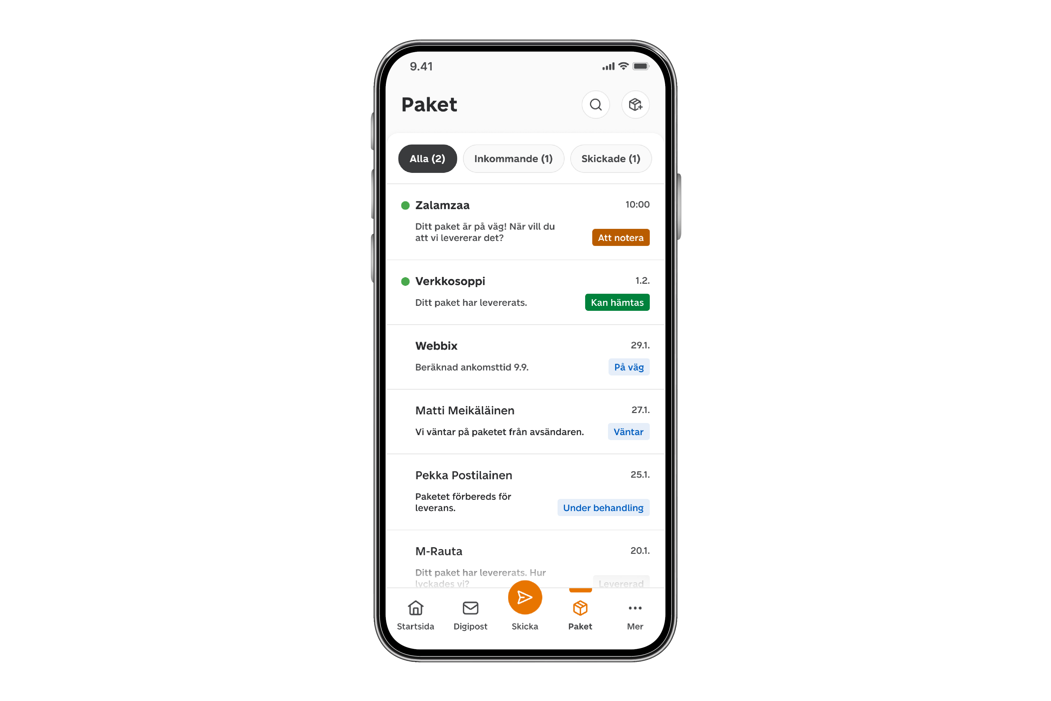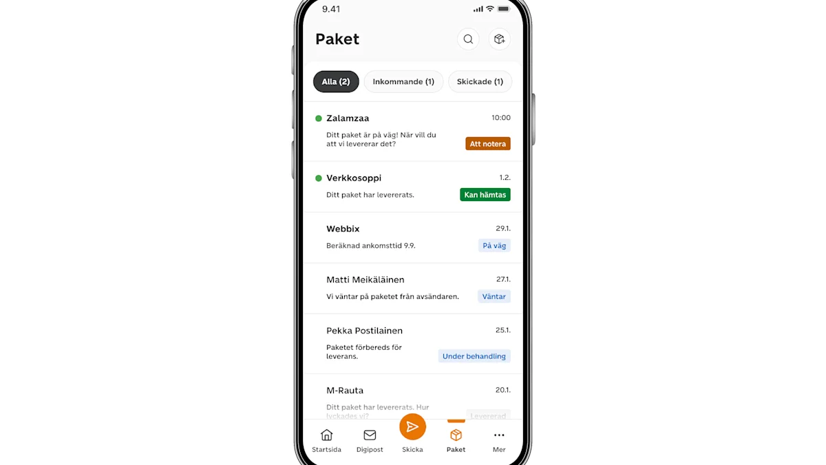 Som standard ser du i listan alla paket som är på väg eller väntas komma. Om du vill kan du också titta på mottagna och skickade paket på egna flikar.